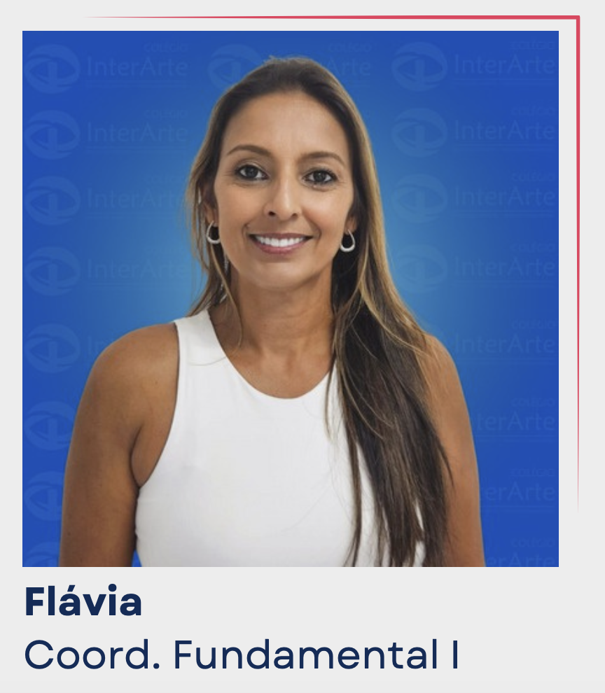 Flávia Meu nome é Flávia. Atualmente atuo como coordenadora pedagógica no Ensino Fundamental do Colégio InterArte. Fui convidada a fazer parte do projeto em 2010, para cobrir uma licença na Educação Infantil e desde então já se foram quase 15 anos de experiências, vivências, desafios, trocas e principalmente muito amor dedicado a esses seres fantásticos, que são as crianças.