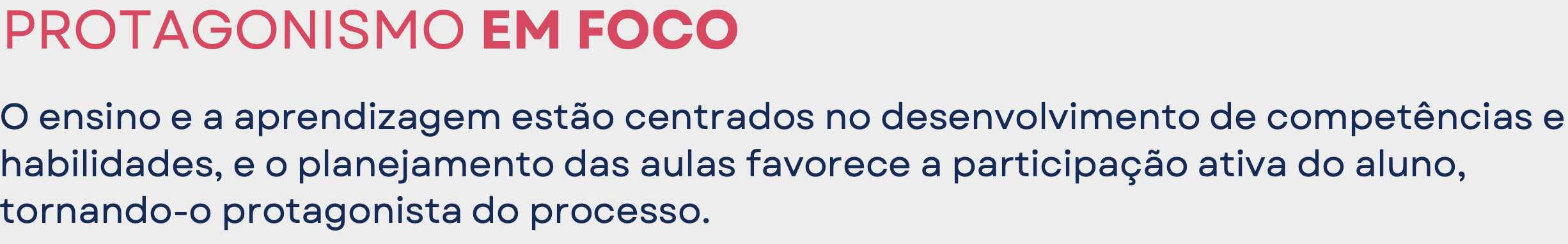 O ensino e aprendizagem estão centrados no desenvolvimento de competências e habilidades, e o planejamento das aulas favorece a participação ativa do aluno tornando-o protagonista do processo.